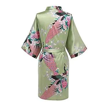 Show more Introducing our exquisite Women's Short Kimono Robes, artfully designed for brides and bridesmaids alike. Crafted from high-quality polyester fabric, these robes offer not just a silky look and touch, but also an exceptional drape that flows gracefully around you. Imagine wrapping yourself in the softness of satin that feels as luxurious as it looks! The mint green hue combined with stunning peacock and peony floral patterns adds a unique elegance, making this robe a remarkable choice for any special occasion.