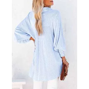Women's Smocked Cuffed Striped Boyfriend Shirt with Pocket Casual Collar Long Sleeve Blouse Tops for Pocket Shirred Blue