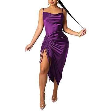 Women's Spaghetti Strap Satin Dress Sexy Backless Drawstring Ruched Split Hem Cocktail Evening Party Purple