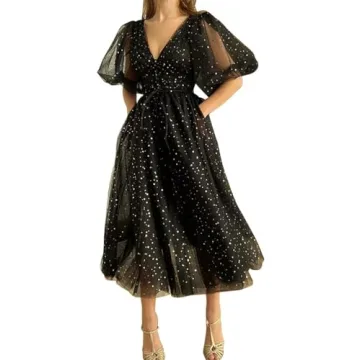 Show moreStep into the spotlight with the enchanting Women’s Sparkle Starry Formal Dress, a beautifully crafted tea-length tulle gown that’s designed to make every wearer feel truly exceptional at special occasions. This exquisite dress is made with mesmerizing starry tulle that features twinkling gold and silver stars, encapsulating an ethereal beauty that’s perfect for every romantic evening or formal affair. Its graceful puff sleeves and flattering A-line silhouette allow for effortless movement, making you feel as if you're floating on air. The inviting v-neck neckline adds sophistication and allure, while convenient fashion pockets provide practicality without compromising on the gown’s elegance. Whether you're attending a prom, an elegant wedding gala, or any other significant event, this dress is your ultimate choice for showcasing your style and charm.