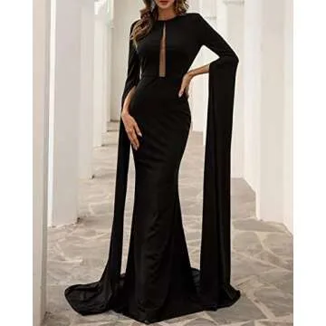 Women's Split Cape Long Sleeve Maxi Dress Evening Wedding Night Gown Party Dresses Black