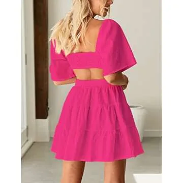 Step into summer with confidence in our Women's Summer Dress featuring a chic square neck design and comfortable fit. Crafted from a blend of 75% polyester, 20% rayon, and 5% spandex, this mini dress offers a soft and lightweight feel, perfect for those warm sunny days or breezy evenings out. The innovative design includes flared short sleeves and a crossover elastic waistband that accentuates your shape beautifully while also allowing flexibility...