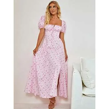 Show moreStep into summer elegance with the Women’s Summer Puff Sleeve Floral Split Maxi Dress. This stunning maxi dress, crafted from a premium blend of 95% polyester and 5% elastane, promises a lightweight and comfortable fit that drapes beautifully against your skin. The soft material is designed to be skin-friendly, ensuring that you feel as good as you look. With its eye-catching pink floral print, puff sleeves, and backless design, this dress is the epitome of summer style, making it an absolute must-have in your wardrobe.