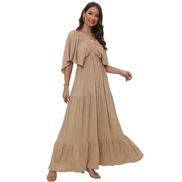 Show moreDiscover the perfect blend of elegance and comfort with our stunning Women's Summer V-Neck, Tiered Silhouette with Flutter Sleeves Maxi Dress. This exquisite piece is thoughtfully designed for every occasion, from a sunny brunch to a sophisticated evening out. Crafted from a soft, textured fabric, it drapes beautifully over your body, providing both style and comfort. The unique V-neck design paired with a graceful tiered silhouette and flutter sleeves adds a touch of femininity that will make you feel effortlessly chic. Whether you are dressing up for a special event or seeking a comfortable option during casual outings, this dress has you covered.