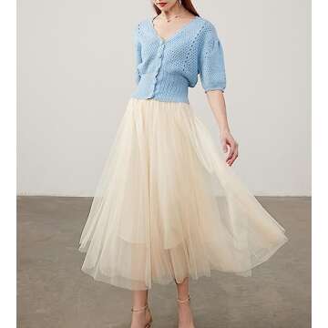 Women’s Tulle Skirts Midi Elastic High Waist Pleated Mesh Flowy A-Line Party Long Tutu Skirt