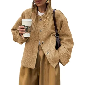 Women's Tweed Jackets Long Sleeve Business Button Down Casual Cropped Blazer with Pockets Camel