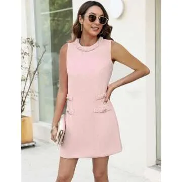 Women's Tweed Jackie Dress Crew Neck Sleeveless Elegant Vintage Button Bodycon A-line Mini Dresses Pink