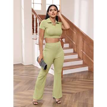 Women’s Two Piece Workout Set Short Sleeve V-Neck Tank Crop Top and High Waist Long Pant Sets Outfit Green