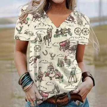 Women's Western Shirt Casual Cactus V-Neck T-Shirt Cowgirl Western Pattern Short Sleeve Loose Ladies Western Tops (T-Shirts-9,Small)