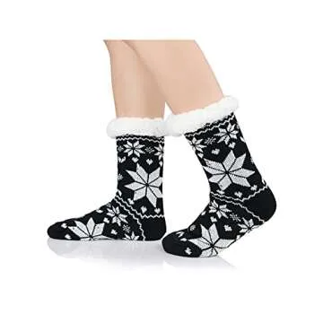 Show moreIntroducing our **Women's Winter Slipper Socks with Grippers**, a perfect blend of style and comfort designed to keep your feet warm during those chilly winter months. Crafted with a luxurious blend of Acrylic and Polyester, these socks feature a plush fleece lining that feels incredibly soft against your skin, ensuring ultimate coziness without any itching. The vintage and trendy cable knit design in classic black with a snowflake pattern makes them not just functional but also a stylish accessory that complements any winter outfit. Ideal for lounging at home, these slipper socks are truly your feet's best friend when braving the cold.