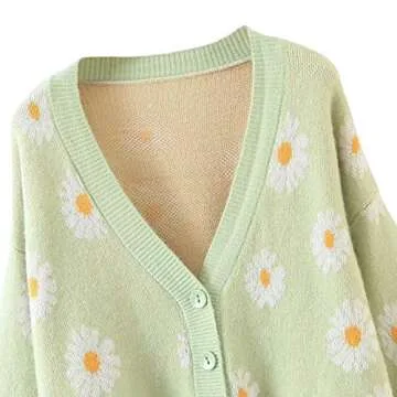 Women's Y2K Floral Smile Face V Neck Long Sleeve Cardigan Sweater Open Front Button 90s Outerwear (One Size, Light Green Daisy)