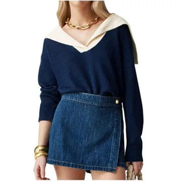 Women Sailor Collar Pullover Sweater Long Sleeves V-Neck Knit Ribbed Jumper Tops Navy