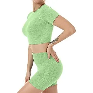 Women Seamless Yoga Workout Set 2 Piece High Waisted Outfits Sets Crop Tops Exercise Shorts Tracksuits Green
