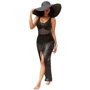 Women Sexy Bikini Cover Up Casual Scoop Neck Sleeveless See Through Crochet Mesh Swimwear Summer Beachwear Dress Split