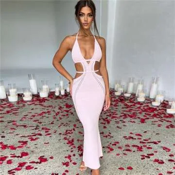 Women Sexy Crochet Maxi Dress Cut Out Halter V Neck Backless Knit Bodycon Long Dress Summer Beach Evening Party Dresses Pink
