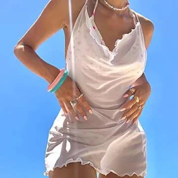 Women Sexy Mesh See-Thru Swimsuit Cover-Up Dress Halter Backless Ruffled Beach Sundress (Medium, White)