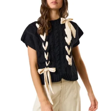 Women Sleeveless Lace Up Ribbon Sweater Mock Neck Cap Sleeve Knit Vest Cute Bow Crochet Pullover Y2k Aesthetic Top Black