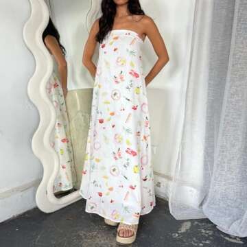 Women Strapless Maxi Dress Boho Floral Print Flowy Long Tube Dress Off Shoulder Loose Beach Sundress (Colorful, L)