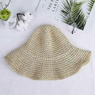 Women Straw Hat Wide Brim Beach Sun Cap Foldable Large Lady Floppy 100% Natural Paper Braided for Travel Decoration Summer Vacation Soft Lightweight and Breathable (Beige)