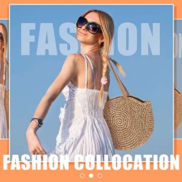 Women Straw Woven Tote Summer Large Beach Handmade Weaving Shoulder Bag with 4 Pairs Rattan Geometric Tassel Earrings(Round)