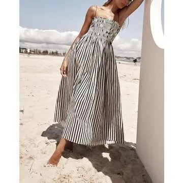 Show moreIntroducing the ultimate Women Striped Maxi Dress Smocked Backless Spaghetti Strap Long Flowy Dress, a perfect blend of style and comfort that every woman needs in her wardrobe. This stunning summer sundress is crafted from a high-quality polyester blend, designed to be lightweight, breathable, and exceptionally comfortable against the skin. With its chic boho stripes and playful smocked back, this dress promises to turn heads while keeping you feeling carefree and stylish.