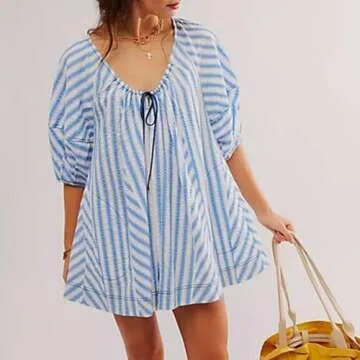 Women Striped Summer Rompers Oversized Puff Sleeve Tie Front Short Jumpsuits Casual Vacation Outfits