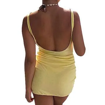 Women Summer 2 Piece Outfits Set Square Neck Backless Bodysuit Jumpsuit Low Wait Bodycon Skirt Matching Set (B Yellow,Medium)