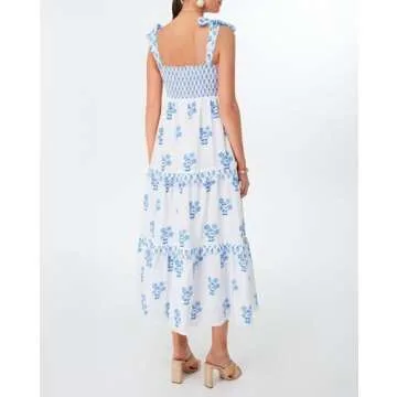 Women Summer Boho Tie Shoulder Dress Y2k Floral Smocked Flowy Long Dress Ruffle Tiered Beach Vocation Sundress(Blue,Medium)