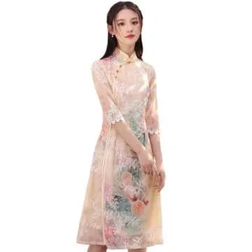 Women Summer Dress,Embroidered Ao Dai Cheongsam Dress,Chinese Style Qipao Hanfu Tang Suit (Champagne-Gold, 5XL)