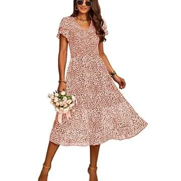 Women Summer Floral Dress Flowy Ruffle Short Sleeve Midi Easter Dresses Brown S