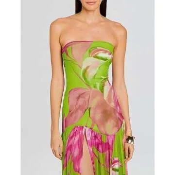 Women Tube Top Dress Tiger Stripe Mesh Patchwork Maxi Dress Strapless Sexy High Slit Long Dresses Party Clubwear (Green,M)