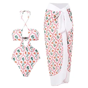 Women Two Pieces Swimsuits with Sheer Cover Ups Cheeky Push Up Bathing Suits with Wrap Skirt Halter Flattering High Cut Bikini Set Floral Sexy Plunge Summer Bandeau Swimwear White Halter S