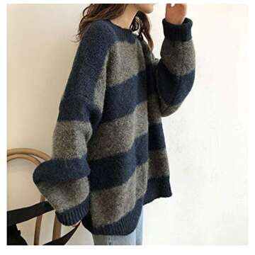 Women Vintage Striped Sweater Knitted Long Sleeve Loose Oversized Pullover Jumper Tops Blue