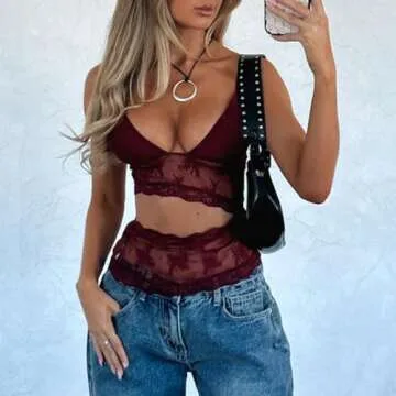 Women Y2k Cami Shirt Sexy Spaghetti Strap Crop Top Backless Going Out Camisole Vest Tank Tops (US, Alpha, Small, Regular, Regular, Lace 01-Red)