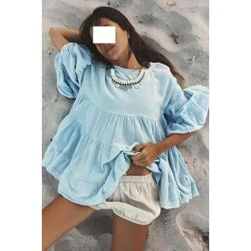 Women Y2k Cute Puff 3/4 Sleeve Cotton Ruffle Shirts Solid Crew Neck Peplum Babydoll Top Fall Going Out Flowy Blouse Blue