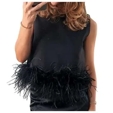Women Y2K Feather Crop Tank Top Sleeveless Faux Fur Trim Rave Camisole Shirt Blouse Tops for Festival Club Party Black