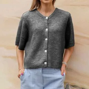 Women Y2k Knitted Crop Cardigan Short Sleeve Button Up Rib Knit Solid Color Cute Sweater Shirt (US, Alpha, Large, Regular, Regular, Dark Grey)
