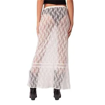 Women Y2k Lace Maxi Skirt Summer Sexy See Through Long Lace Skirt Casual Boho Fairy Grunge Midi Lace Skirt (White-Low Waist, M)