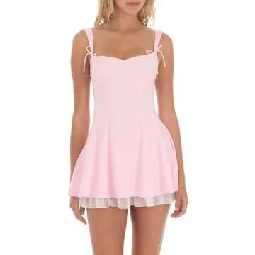 Women Y2k Lace Mini Dress Ruffle Hem Tie Back Short Dress Flowy A Line Bodycon Dress Party Clubwear(E Pink,s)