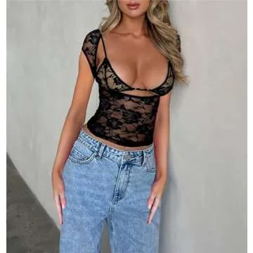 Women Y2k Lace Short Sleeve Top See Through Mesh Crop Top Floral Slim Fit Layering Top Tee Shirt Blouse Streetwear (C1-Short Sleeve Black, S)
