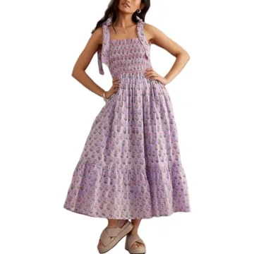 Women Y2k Summer Flowy Maxi Sundress Boho Floral Smocked Beach Dress Cute Shoulder Tie Spaghetti Strap Long Dresses Purple