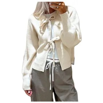 Women Y2k Tie Front Knitted Cardigan Sweater Top Long Sleeve Crewneck Open Front Casual Cropped Cardigan Shirt (Apricot #A, XL)