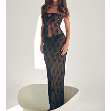 Women Y2k Two Piece Sets Sexy Tube Top Bodycon Lace Maxi Skirt 2 Piece Going Out Outfits Black S