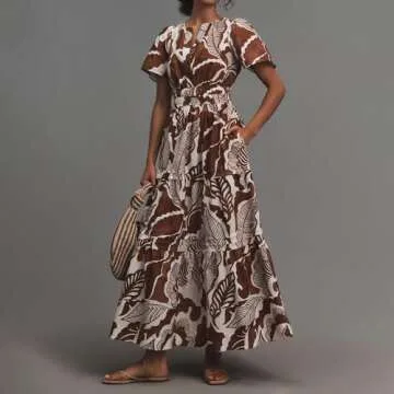 Womens 2024 Summer Maxi Dress Silhouette A-line Dress Bohemian V-Neck Pleated Puffy Sleeves Brown Print Casual Dress