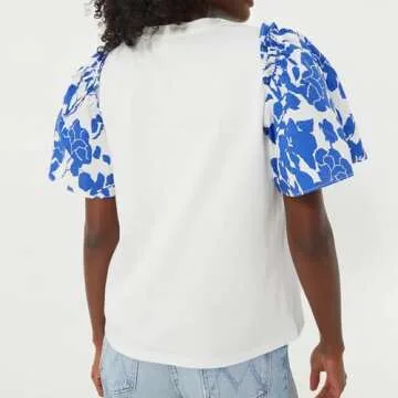 Womens 2024 Summer White T Shirt Blue Floral Short Puff Sleeve Blouse Casual Summer Tops