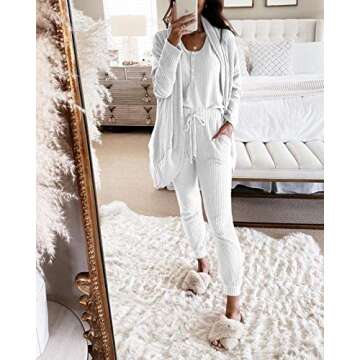 Womens 3 Piece Lounge Pajamas Sets Cami Tank Top & Soft Pants and coat Waffle Knit Loungewear White