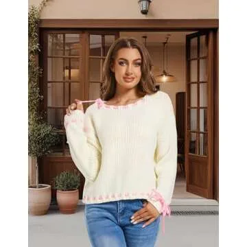 Womens Bow Pullover Sweater Y2K Crop Drop Shoulder Knitwear Loose Casual Outfits White