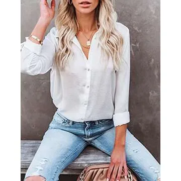 Womens Button Down Shirts Long Sleeve Casual Work Blouses Vneck Loose Tunics Plain Office Tops White L