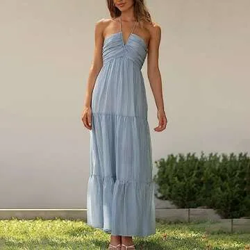 Womens Chiffon Halter Neck Dress Summer Casual Sleeveless Tiered Pleated Holiday Elegant Flowy Maxi Strap Dress Blue