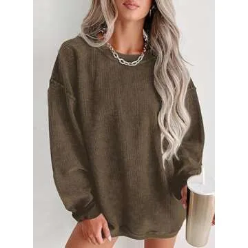 Womens Crewneck Corded Sweatshirt Casual Long Sleeve Oversized Trendy Pullover Comfy Tops(BR,M)